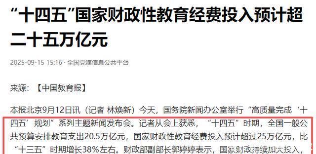 但是实际上中国变得强大绝对不是一朝一夕的事情,这是一个从量变到质变的过程。 只不过大家只是看到了结果,却忽略了中国崛起的过程。 实际上中国的崛起应该要从教育说起,将科教兴国作为基本国策,这绝对是最英明的政策。 国家想要发展需要依赖的是劳动力,而想要让科技产业迅速发展,就需要依赖高素质劳动力。 当年讲的是科教兴国,要让更多摆脱文盲的帽子,现在的教育被称为高质量发展。 这意味着教育在当下已经实现了一个质的转变,打造高素质全面发展的人才才是当下社会的主要目标。 据相关媒体报道,“十四五”期间,全国一般公共预算安排教育支持20.5万亿元,国家财政性教育经费投入预计超过25万亿元,这也比“十三五”时期增长了38%。