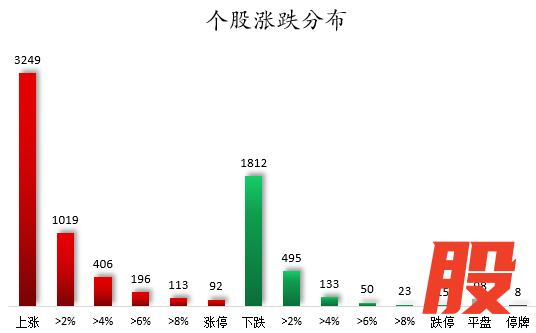 个股涨跌情况,截至收盘,沪深两市合计3249只个股上涨,1812只个股下跌,平盘个股98只,停牌的个股8只。不含当日上市新股,共有92只个股涨停,15只个股跌停。