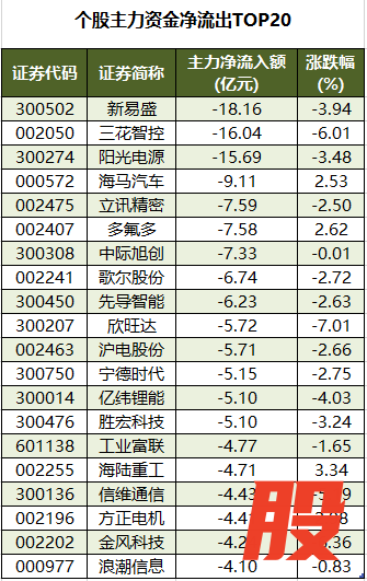 今日有3052只个股被主力资金净卖出,其中,128股被主力资金净卖出超1亿元。主力资金净流出最多的个股是新易盛,净流出金额为18.16亿元;主力资金净流出居前的个股还有三花智控、阳光电源、海马汽车、立讯精密、多氟多等,净流出金额分别为16.04亿元、15.69亿元、9.11亿元、7.59亿元、7.58亿元。