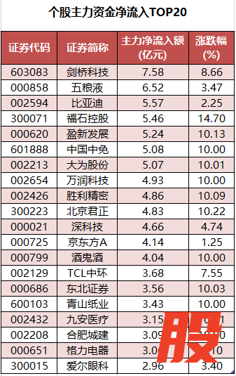 从个股来看,今日有2106只个股获主力资金净流入,其中,88股获主力资金净流入超1亿元。剑桥科技主力资金净流入最多,净流入金额为7.58亿元;主力资金净流入居前的个股还有五粮液、比亚迪、福石控股、盈新发展(维权)、中国中免等,净流入金额分别为6.52亿元、5.57亿元、5.46亿元、5.24亿元、5.08亿元。