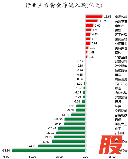 从行业来看,申万所属的31个一级行业,今日有10个行业主力资金呈现净流入,其中,食品饮料行业主力资金净流入最多,净流入金额为15.63亿元;行业主力资金净流入居前的还有商贸零售、房地产、传媒等,净流入金额分别为11.24亿元、7亿元、4.95亿元。21个行业主力资金呈现净流出,其中,电力设备行业主力资金净流出最多,净流出金额为68.8亿元;行业主力资金净流出靠前的还有电子、机械设备、汽车、计算机、化工等,净流出金额分别为44.2亿元、31.69亿元、29.73亿元、27.19亿元、25.44亿元。